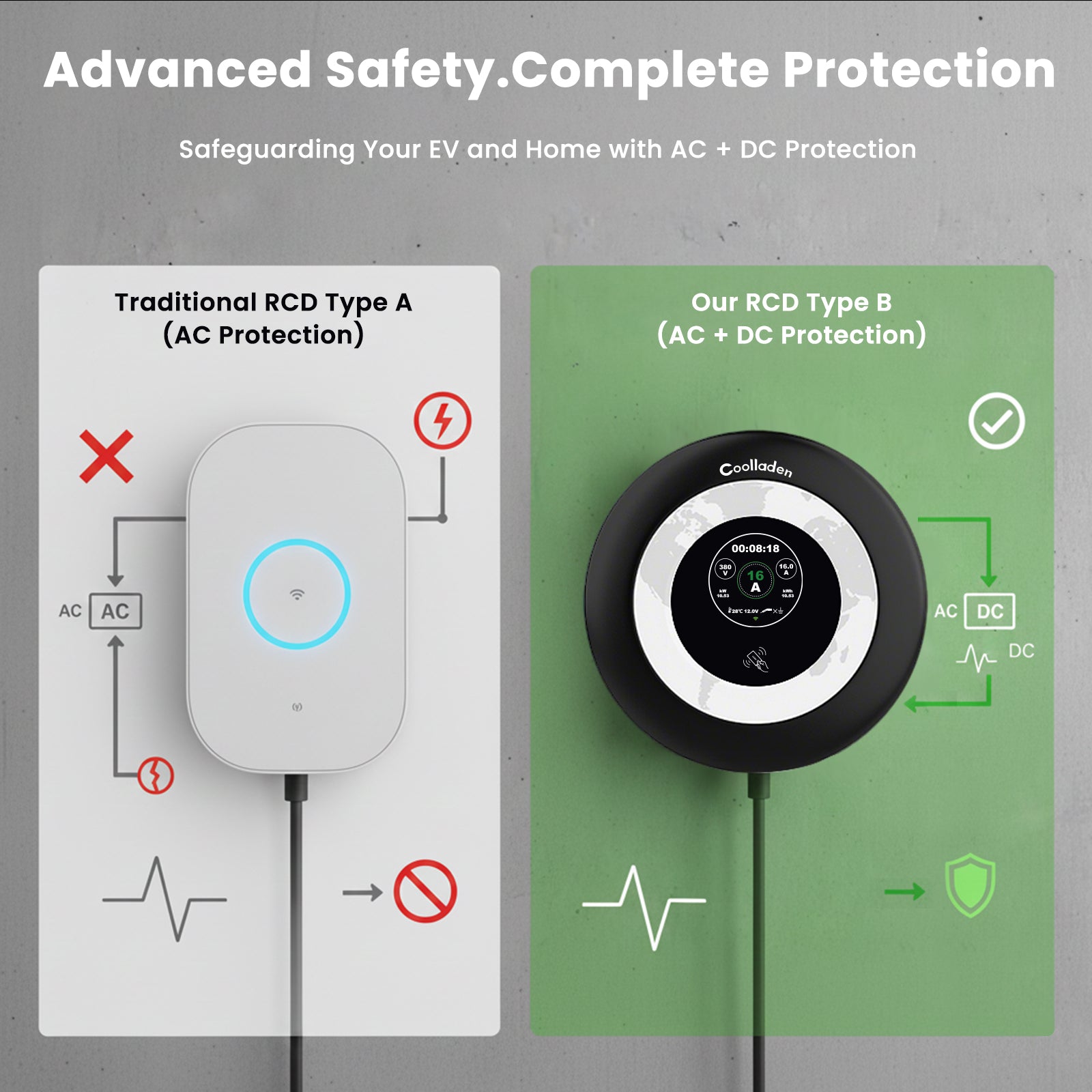 La sécurité est la base de l'expérience Coolladen. Entièrement certifié CE et RoHS, notre wallbox intègre un capteur RCD Type B (AC 30mA + DC 6mA).