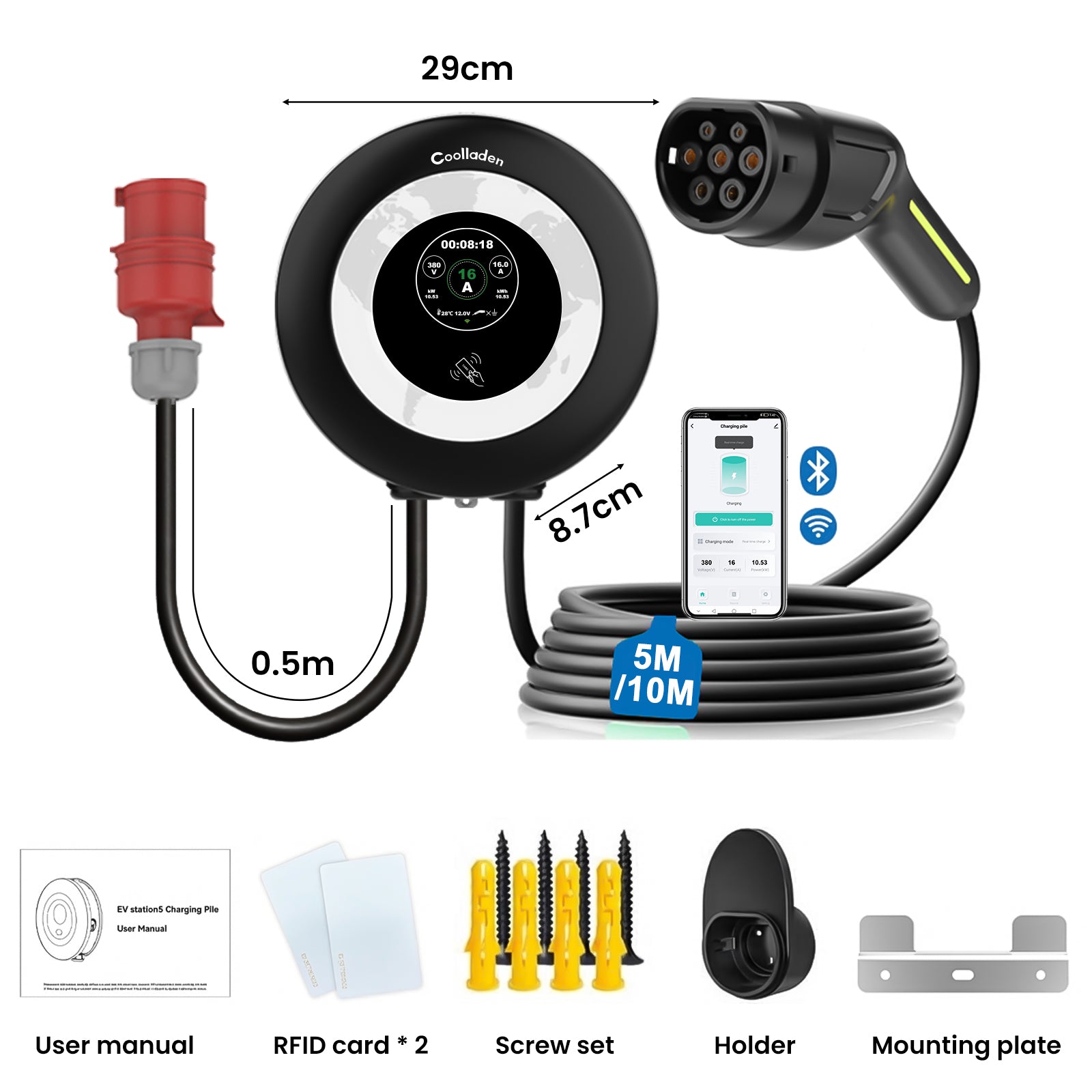 📦 Contenu de la boîte : 1x Wallbox, 2x Cartes RFID de sécurité, Kit de fixation murale, Support de câble, Manuel d'utilisation.