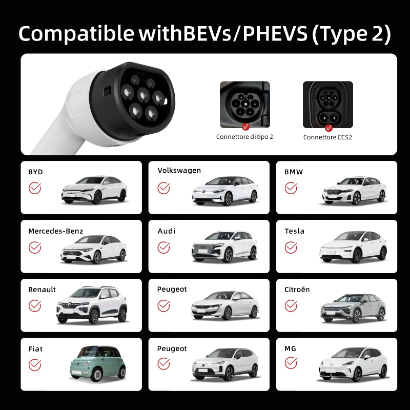Universal Compatibility: Fully compliant with IEC 62196-2 standards. Supports all Type 2 Electric Vehicles and Plug-in Hybrids (PHEV) including Tesla, VW, BMW, Audi, Mercedes, Hyundai, Kia, and more.